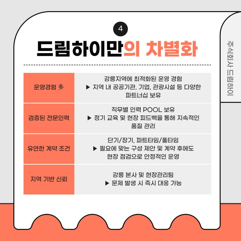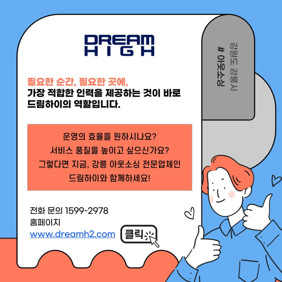 서비스 품질을 높이고 싶으신가요? 그렇다면 지금, 강릉 아웃소싱 전문업체인 드림하이와 함께하세요! |