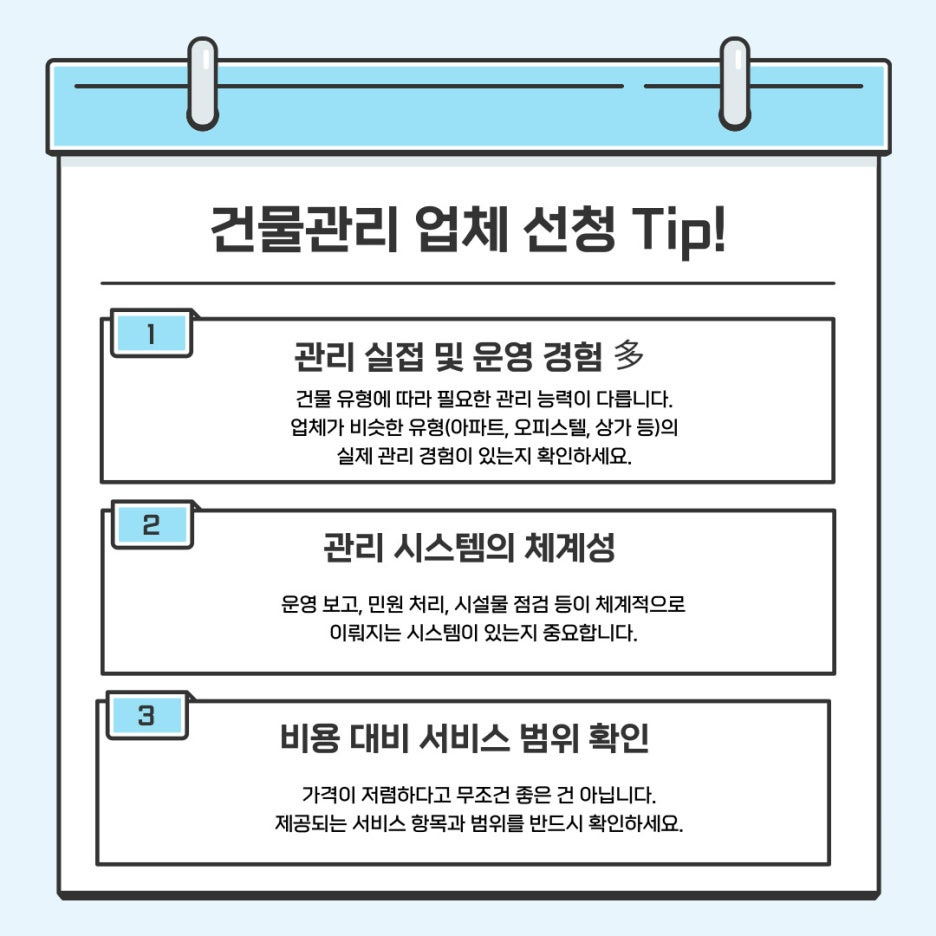 업체가 비슷한 유형(아파트, 오피스텔, 상가 등)의 실제 관리 경험이 있는지 확인하세요.