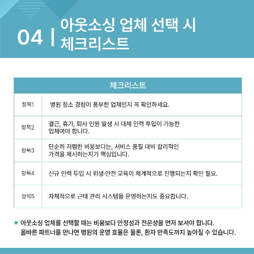 🔹 아웃소싱 업체를 선택할 때는 비용보다 안정성과 전문성을 먼저 보셔야 합니다.