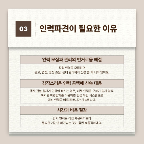 오늘은 여러분께 꼭 필요한 ‘단기행사 인력파견’ 서비스를 소개해드릴게요