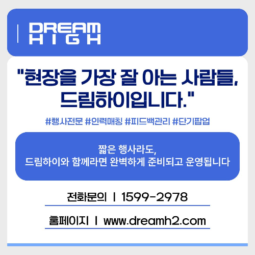 | 단기행사부터 대형 박람회까지! 현장 운영은 드림하이와 함께 (0) | 2025.10.24 |